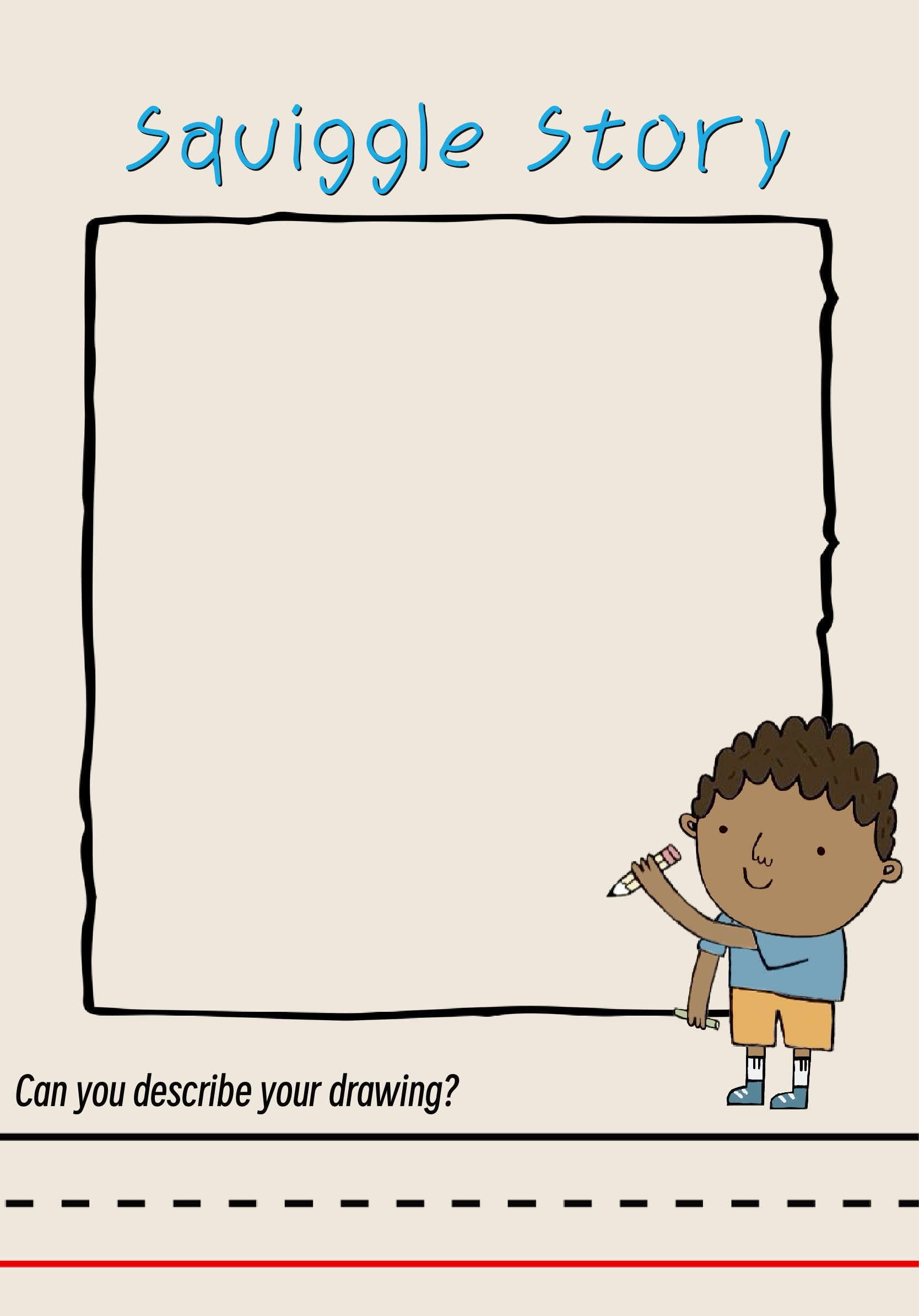 A worksheet for our kindergartners about a story “A Squiggly Story”, I drew inside the box a squiggle and we asked the students to complete it using their imagination, and then they asked to describe their drawings in a simple sentence.