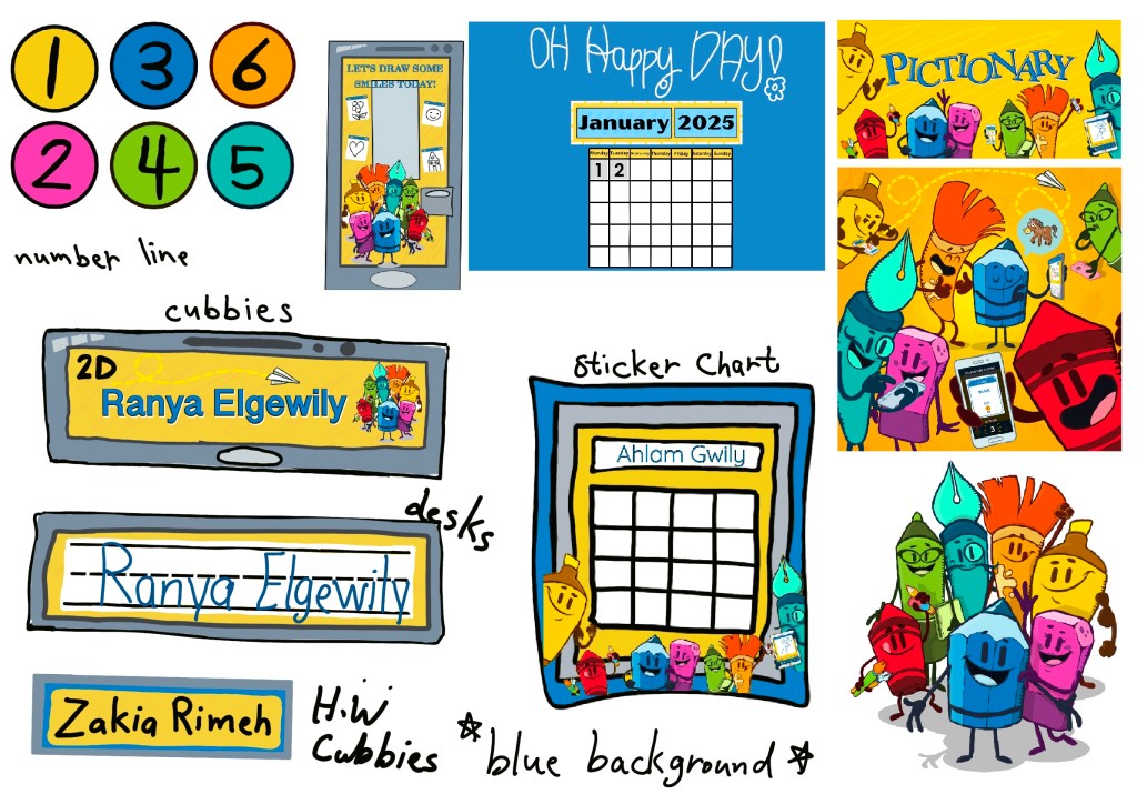 A classroom theme inspired by the “Pictionary” game. The school asked us to create general themes, but for us we created the most cutest theme ever.