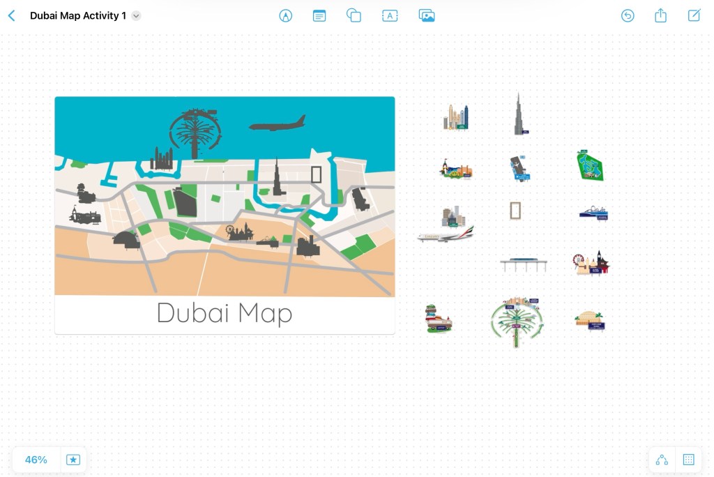A digital puzzle about maps, I designed Dubai map inspired by the real map on Visit Dubai Website, but I designed a simpler version to suitable for our kindergartners to teach them the real places in Dubai.