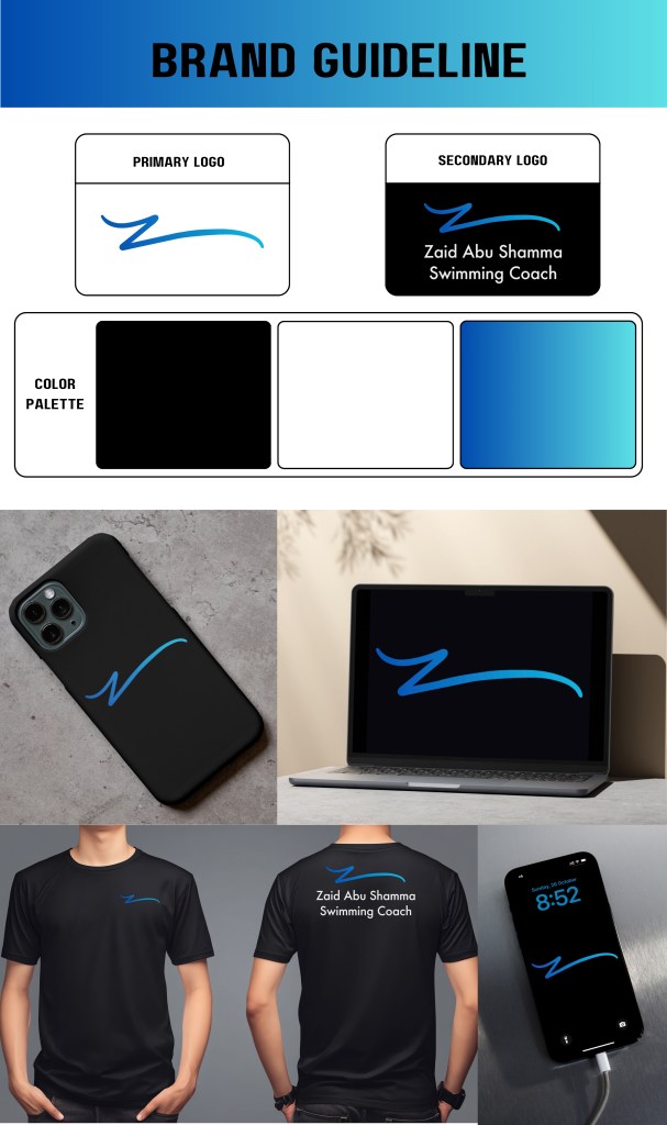 The gradient blues reflect clarity, calmness, and strength, capturing the spirit of Coach Zaid’s coaching philosophy and the confidence he aims to build in every swimmer.