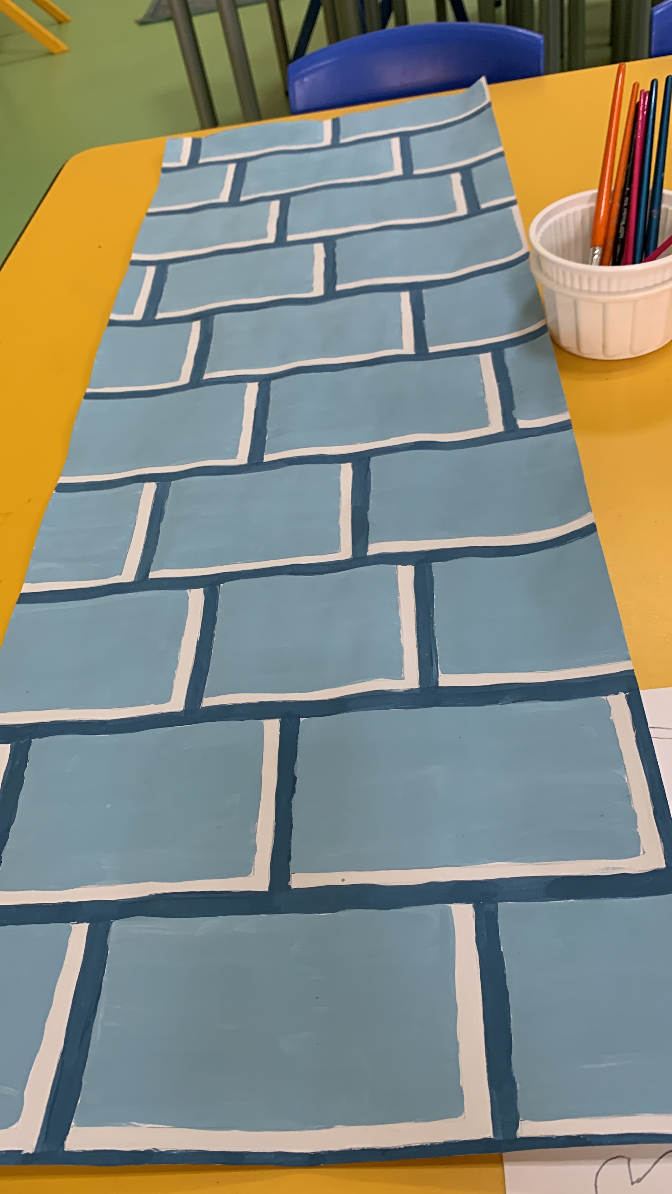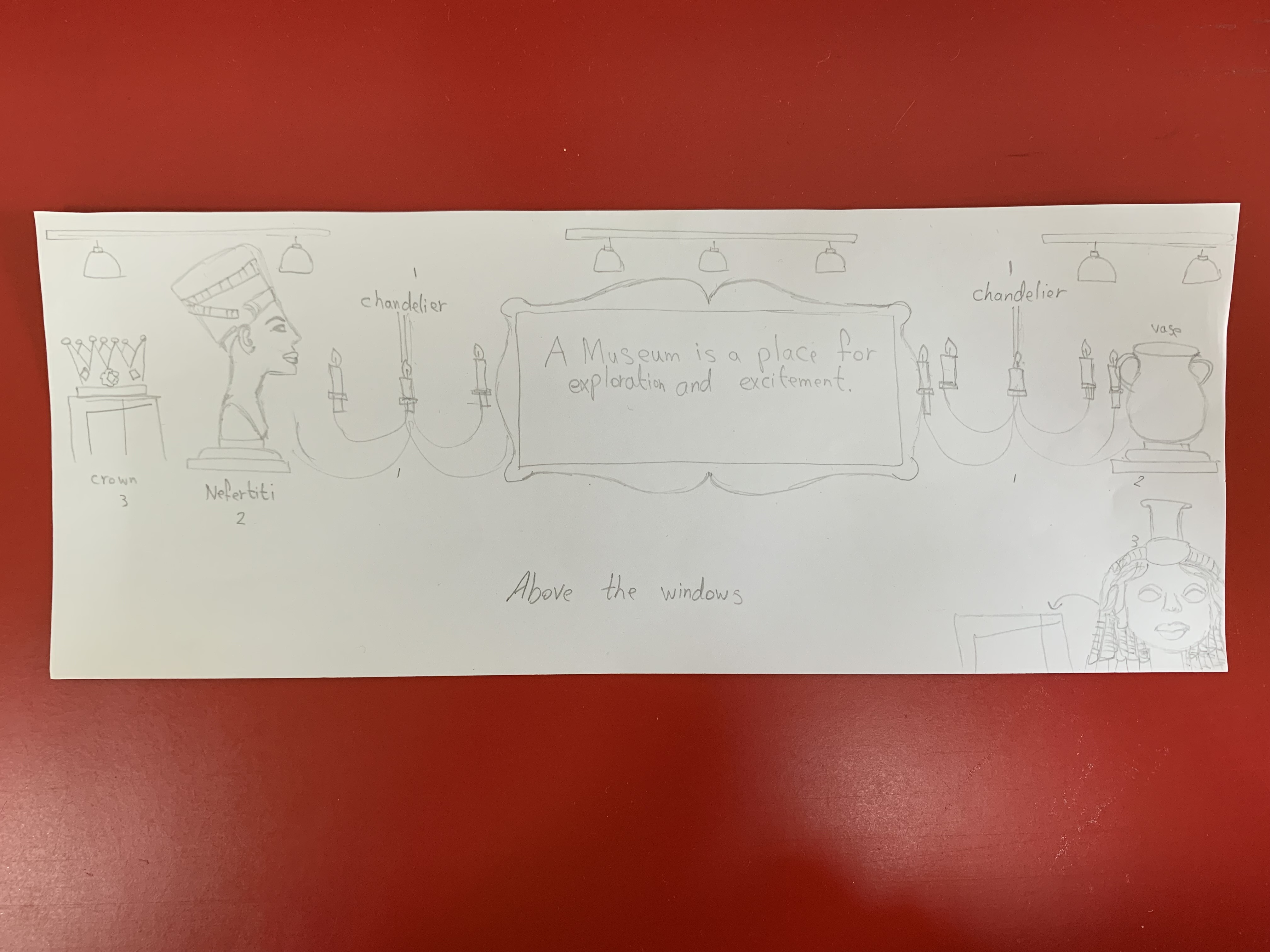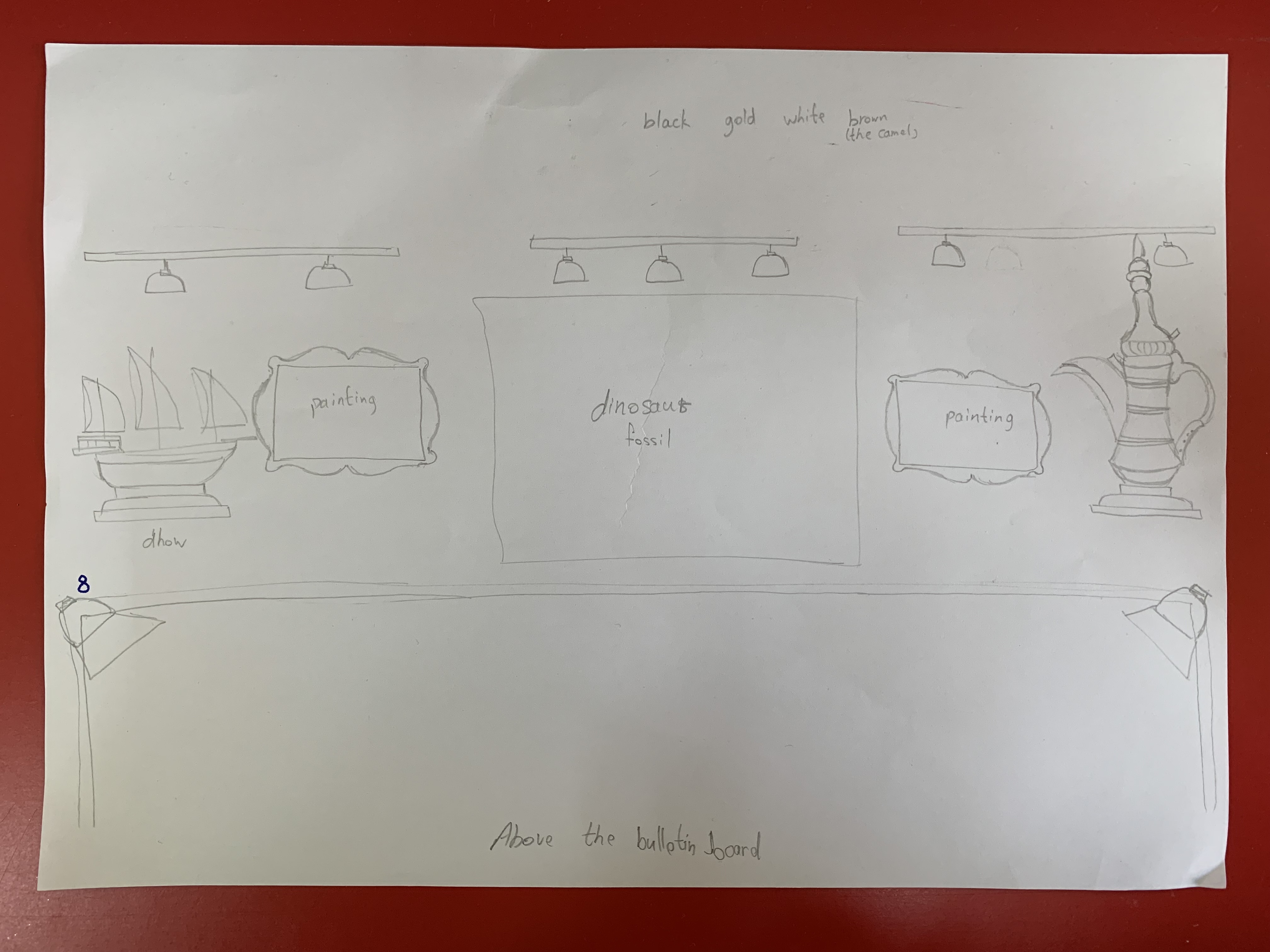 We tried to get all the decorations, starting from outside the classroom to the inside, to be related to each others and get the feeling that it’s really a museum but for kids. The numbers on the blocks are for the number line on the floor, I tried to choose the shades of the brown color cause it’s warm and deep, and it represents nature, earth and history.