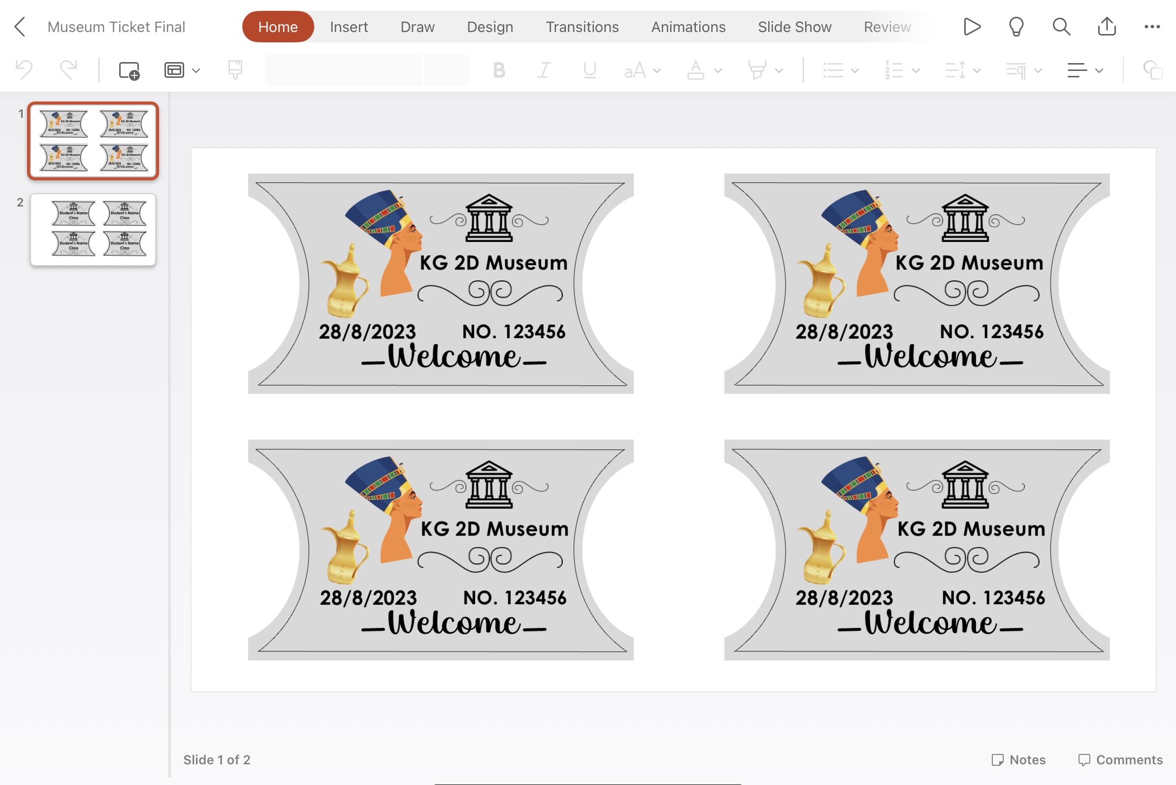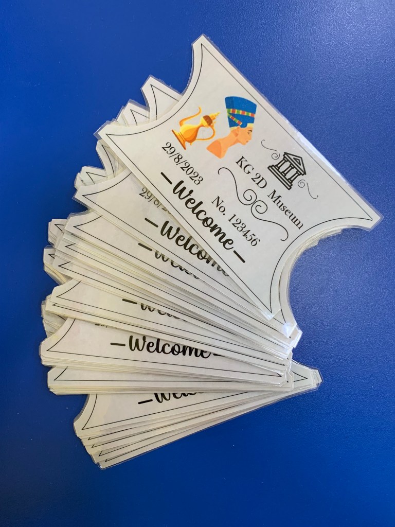 Plus I designed tickets to distribute to the students on the first day of school when they enter the classroom with the date of their first day ‘29/8/2023’ and our classroom ‘KG 2D’.